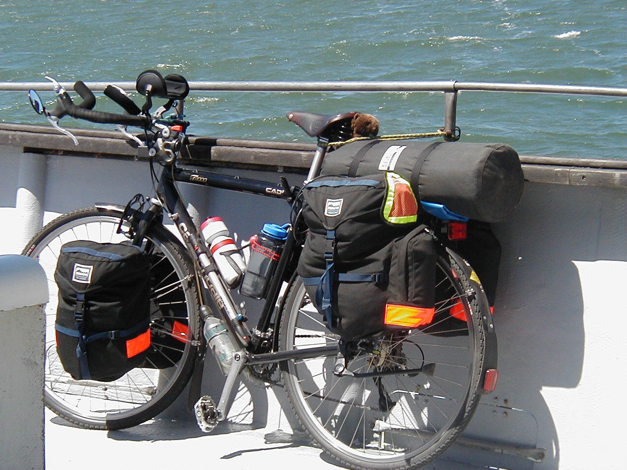 Anyhow, I've seen and talked to a lot more cyclists today - there's one big group heading down to California, they have a van to carry all their gear - wimps! - Just kidding! But there are lots of other ones and twos drifting into the hiker/biker area right now - should be an interesting evening. Basil's never seen so much Lycra in one campground before! I told my tale of being sideswiped to a few of the large group of cyclists; the fellow driving their SAG van couldn't believe that the driver who hit me didn't see me, as he told me that he had passed me earlier and that I was very visible from the rear, with the two fluorescent stripes on my Serratus pannier and my small yellow safety triangle showing up very well from a distance.