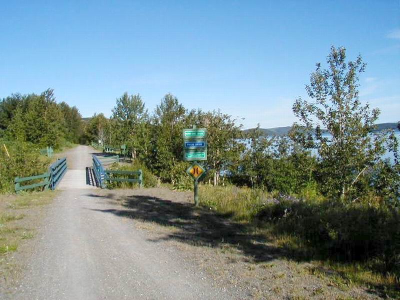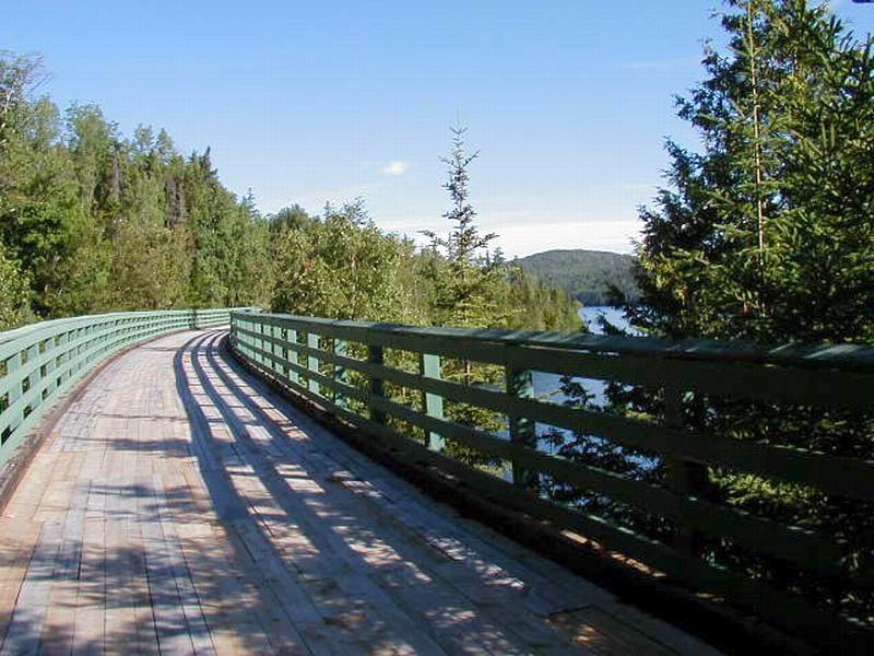 I started out on TC#2 this morning, but after 10km, at Notre Dame du Lac, I came across some major road-works. Both sides of the highway were down to two narrow lanes, with absolutely no room to cycle at the side, resulting in a very close relationship with the big trucks! I could read the fine print on their tires as they rolled by! After two of those, I decided that I'd had enough; it was time to either take the lane - and really piss them off - or walk in the loose dirt of the construction lane. Fortunately, at that point, there was a turn off into the village, so I bailed out and headed for an access to "Le Petit Temis" rail trail. I must have seen a bad portion of it yesterday, for it really is one nice trail. It was a bit dusty, but otherwise really good riding. I rode in peaceful and quiet surroundings along the shores of Lake Temiscouta. I cycled across some small trestles, which brought back memories of riding the KVR rail trail. In fact, it was so nice that I rode it the rest of the way to the border, about 35km. I let my mind wander and imagined myself on the train that used to run on the steel that once lined this route many years ago - just like the KVR - what a great trip it must have been. But we're all too busy for trains nowadays! OK, that's enough nostalgia!