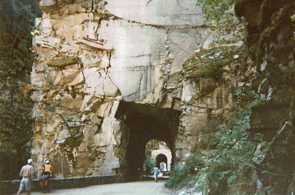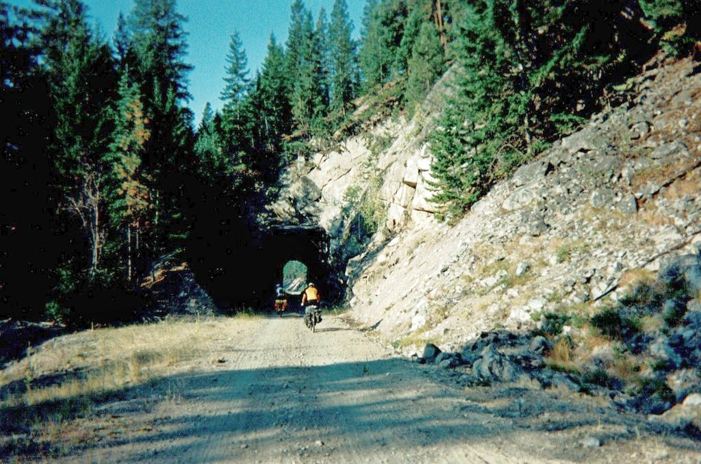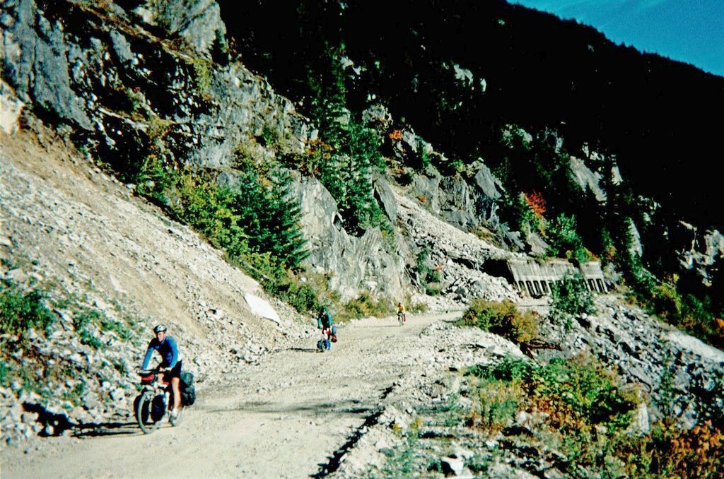 Our next 20 km had to be ridden on the highway as we felt that accessing the short portions of the KVR that we still rideable was not worth the effort. The Coquihalla grade was downhill so we had a fast run to Othello Road, where we did rejoin the KVR. Othello Station is at the start of the Coquihalla Canyon where McCulloch performed his most incredible feat of surveying, then blasting four tunnels in perfect alignment through the canyon walls above the river, simply amazing! The tunnels are connected by trestles. The area is now a Provincial Recreation Area and is known as the Quintette Tunnels (although there are only really four tunnels, but the third tunnel seems as if it were two).