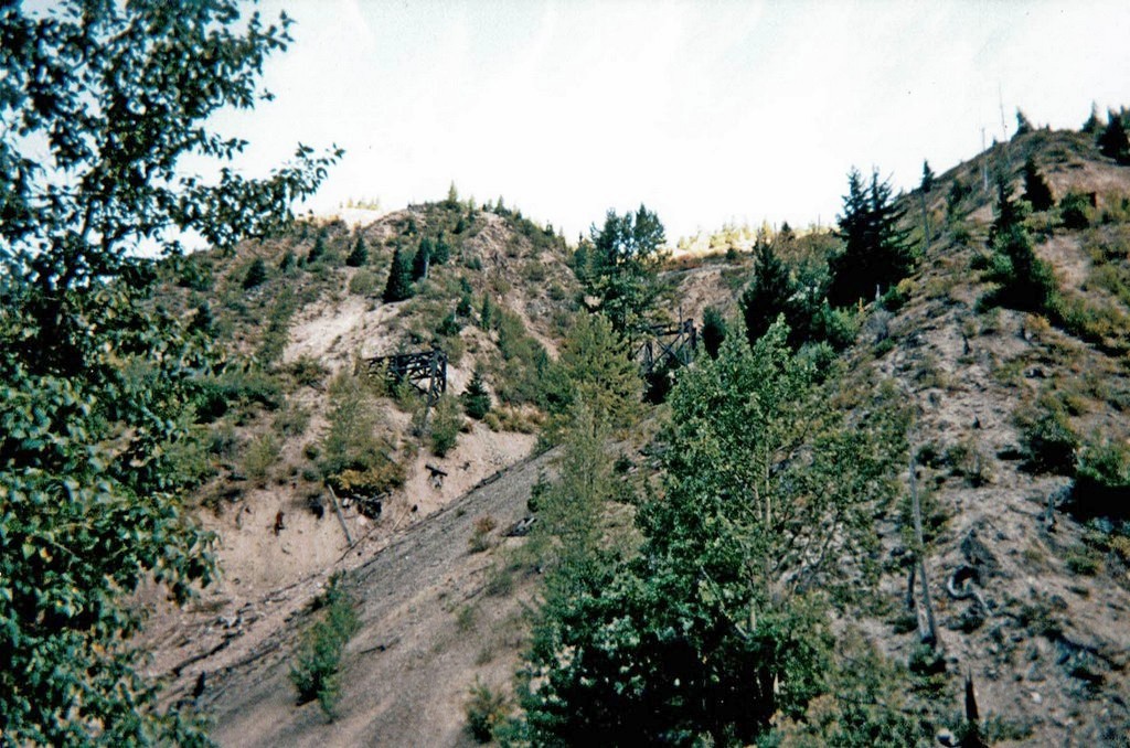 Some parts of the Coquihalla Highway were built almost on top of the original KVR and there are several short sections of the trail that can be ridden. We opted to take the Trans Mountain Pipeline Road, which kind of parallels the highway and takes the same route as the KVR. The Pipeline road is a construction road and on a normal basis access might have been prohibited. But we happened upon it on a long holiday weekend day, so no work was being carried out, which meant absolutely no traffic for us! The road is definitely not rail grade though and is very much like a logging road with variable grades and rough or rocky surface in places. Some grades were exceptionally steep both in the downhill and uphill mode. On some sections, we were actually riding on the KVR and at other times we were on the road looking up at the remains of the railbed, trestles and tunnels above us on the mountainside. The photo shows the remains of one trestle that suffered extensive damage from a large washout. Tunnel entrances could clearly be seen, but the railbed leading up to them was long gone. We cycled around a snowshed that was caved in and saw other such indications of the KVR along this route. The pipeline road ended when we reached the Coquihalla Highway once more, at km 54 of this subdivision.
