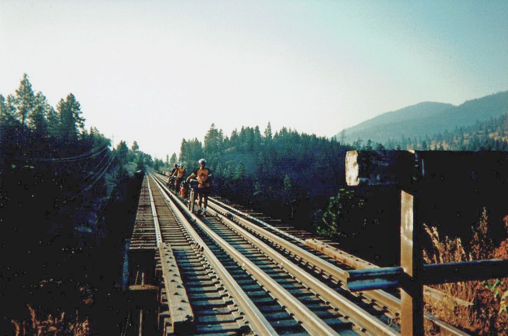 At Faulder we re-joined the railbed which was still a bit sandy. We forded one small creek and then came to a real obstacle as we had to cross Trout Creek and the bridge has been removed. Luckily the hot dry summer had left the water level fairly low, but getting down to it proved to be quite a challenge. The steep bank made it a two man job for each of our loaded bikes, with one guy holding the back of the bike back with a rope, while the other guy held on to the front. Kind of like a rodeo! We still had to take most of our gear off the bikes to get across the creek though. Another two man job getting back up to the railbed too.