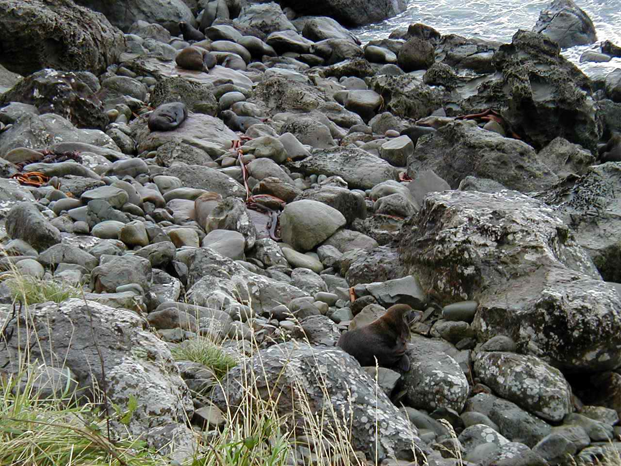 Nevertheless, there was some great coastal and inland scenery. On the Kaikoura coast the black sand beaches began, followed by rock beaches and offshore rock outcrops. It was at these rocky sections that I saw hundreds of seals - normally I would say basking in the sun - today they were cowering in the wind and rain! Anyhow I did manage to snap a photo before the wind whipped the camera away and it washed away in a flash flood - just kidding! Nice to see some real wildlife here though, apart from a variety of birds, dead hedgehogs, dead possums and caged deer, there isn't that much wildlife around.