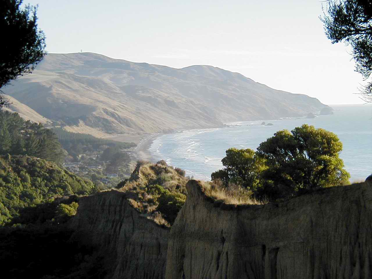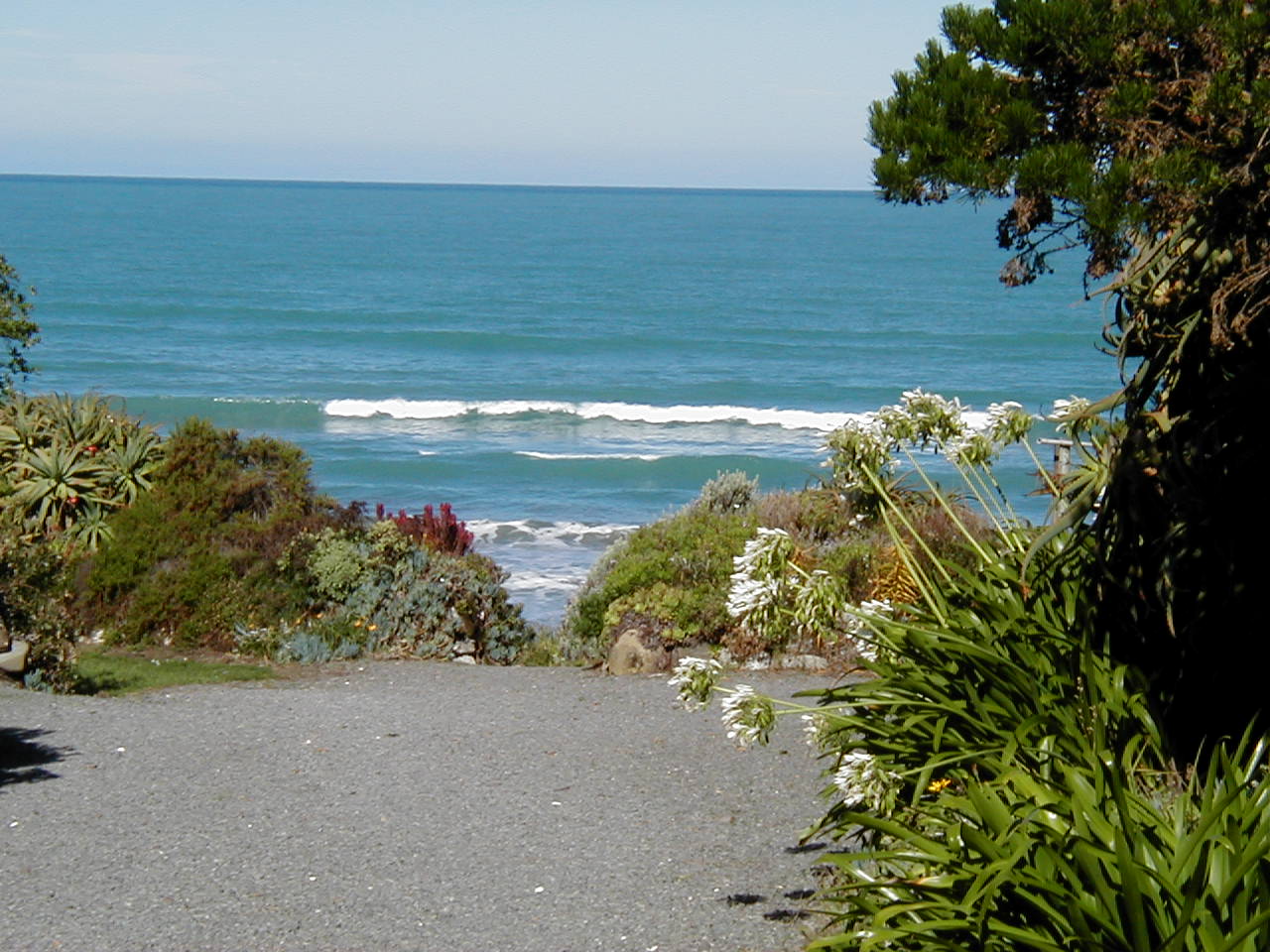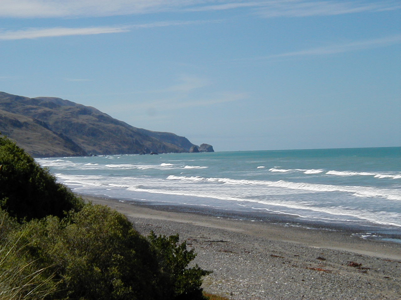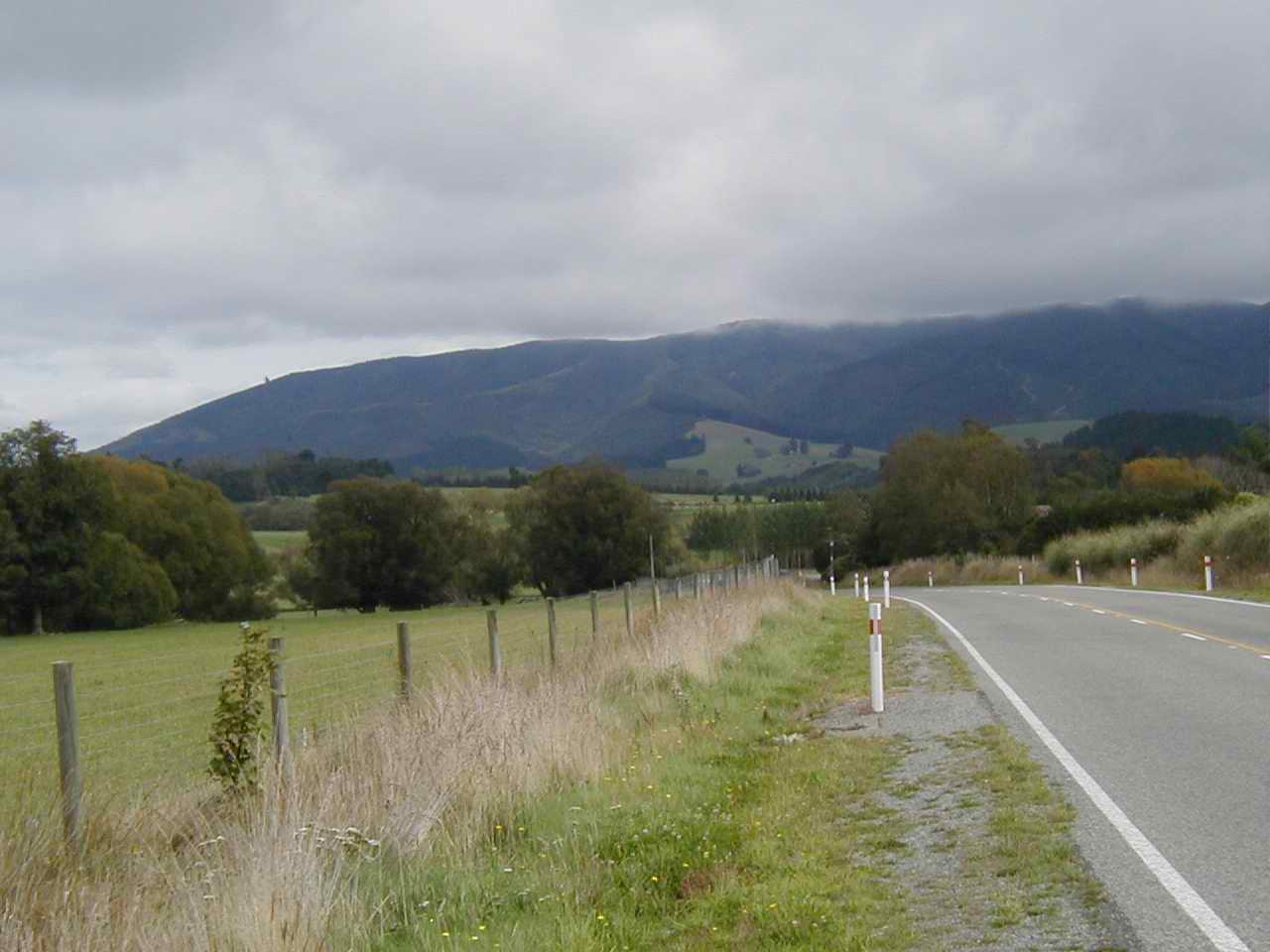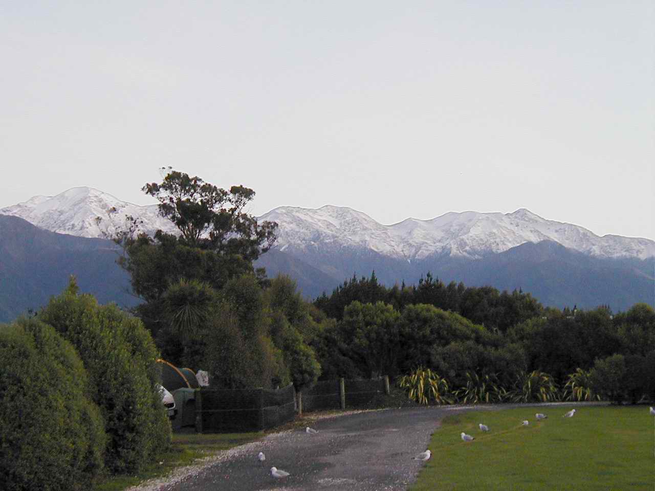 I am smart - sometimes - I'm staying put for the day. I went to the office and paid for another night. The morning paper was there - a quick look at the forecast showed continuing southerly winds up to 60km/hr, and rain. However, it also predicted that the winds would ease later in the day. Also tomorrow's forecast looks quite a bit better - clouds with sunny periods. Of course, the west coast, where I'm trying to get to, has sunshine right now! This is quite out of the norm, as the west coast here is known as the "wet" coast (sound familiar, Pacific North-Westerners?) and this eastern coast down to Canterbury is renowned for it's dry weather. When I was in Blenheim, the motor camp had a lot of seasonal vineyard workers staying there; they told me how the grapes were not very good this year due to the weird weather patterns - too much wet, not enough dry. So here's a tip, don't buy any New Zealand wine from the year 2004!