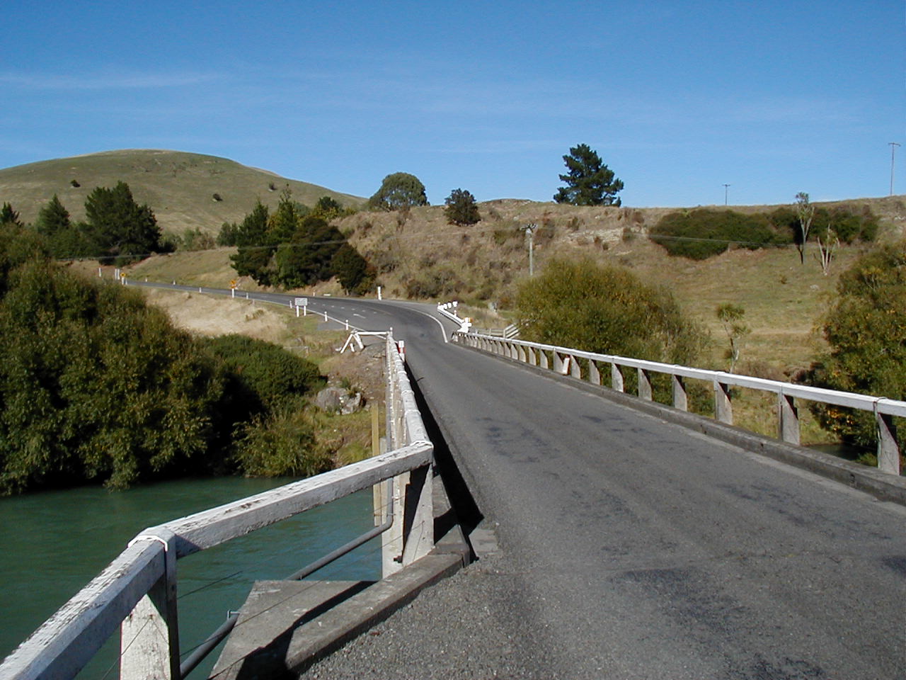 The tent fly was wet from a heavy dew and condensation, but I figured that it would be no problem drying it out later, so I packed up as usual and rode off after my usual quick breaky. The flat road was marred only by a constant light but annoying headwind. Second breaky happened in the small village of Oxford about 35km down the road. The road actually, although seemingly flat, was taking me up a very mild grade. On and on I rode through many more dots on the map and through mostly sheep farmland and numerous small villages. The wind was that same south-east bugger that gave me those headwinds down the coast. And sure enough, the Golden Orb was soon covered with the gray clouds. I stopped in Glentunnel for a quick snack of milk and a pie, after that the road began some undulations and bends - quite a change from 70km of straight road! Anyhow, according to the map, I had to cross Rakaia Gorge and sure enough the road plunged 200m very steeply to find a bridge and cross the Waitikari river. As all we cyclists know, one good plunge begets one big un-plunge - read big, steep hill - to get out of the gorge. My theory held up - one steep climb for 2km! After the gorge the road began a very slight downhill grade - good! Then the rain started - bad!