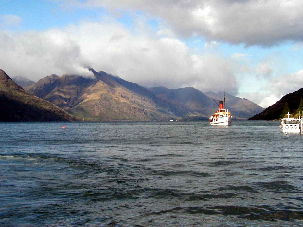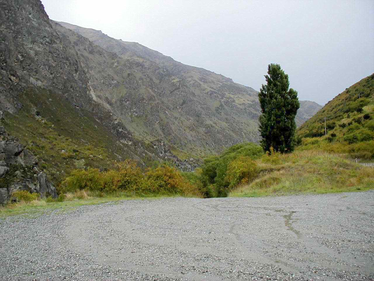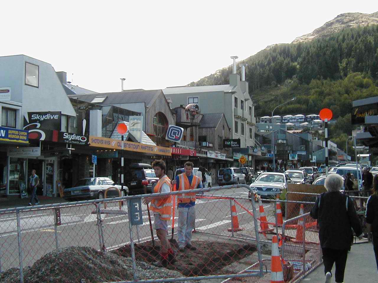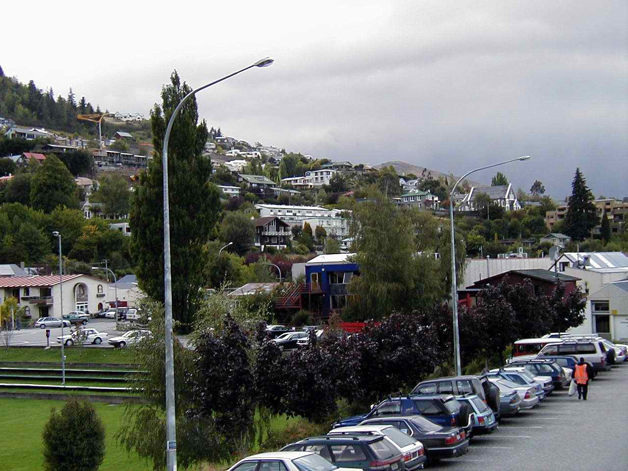 I guess that it was just as well that I did plan a short day, because that rain never did quit. Second breaky was in Frankton, about 7km outside Queenstown. I was like a drowned rat by then, but even a hungry drowned rat has to eat! I stretched out the meal and pot of tea in the nice warm tearoom for as long as I could hoping for a break in the clouds, but the rain just continued. So I set off for the last few kilometres; that's when I hit the road-works - just to put the finishing touches to the day! By the time I arrived in downtown Queenstown, there was even some thunder and lightning happening - what next? I cowered under a store's awning to get my bearings and look around - the place was a total tourist zoo - cars, buses pedestrians all bustling about in the pouring rain!
