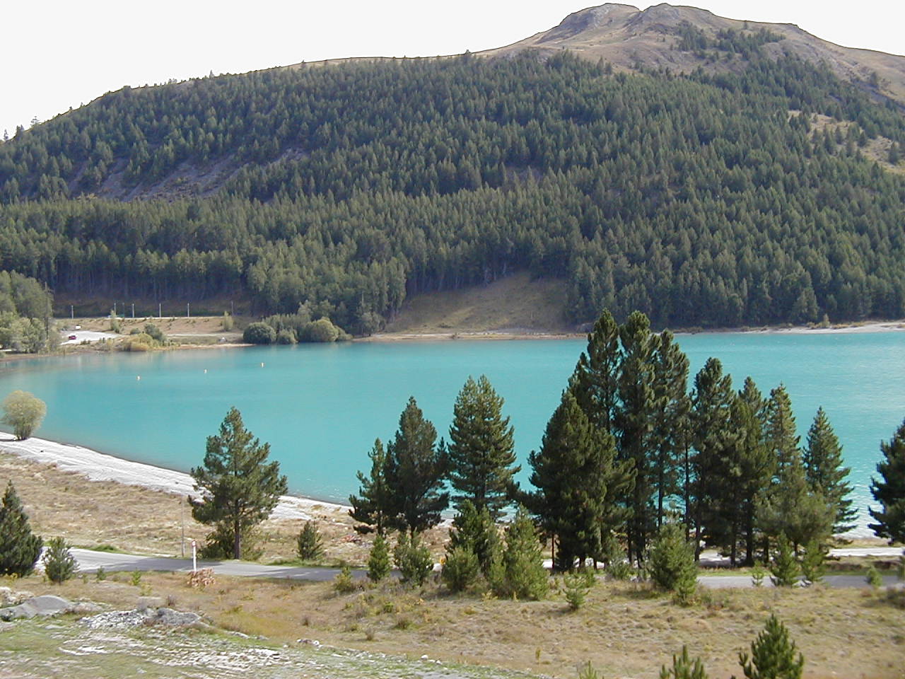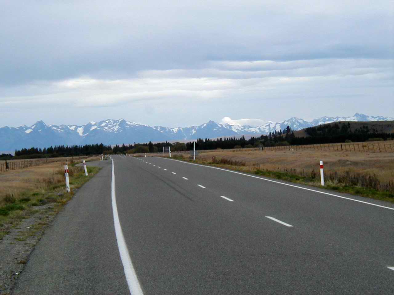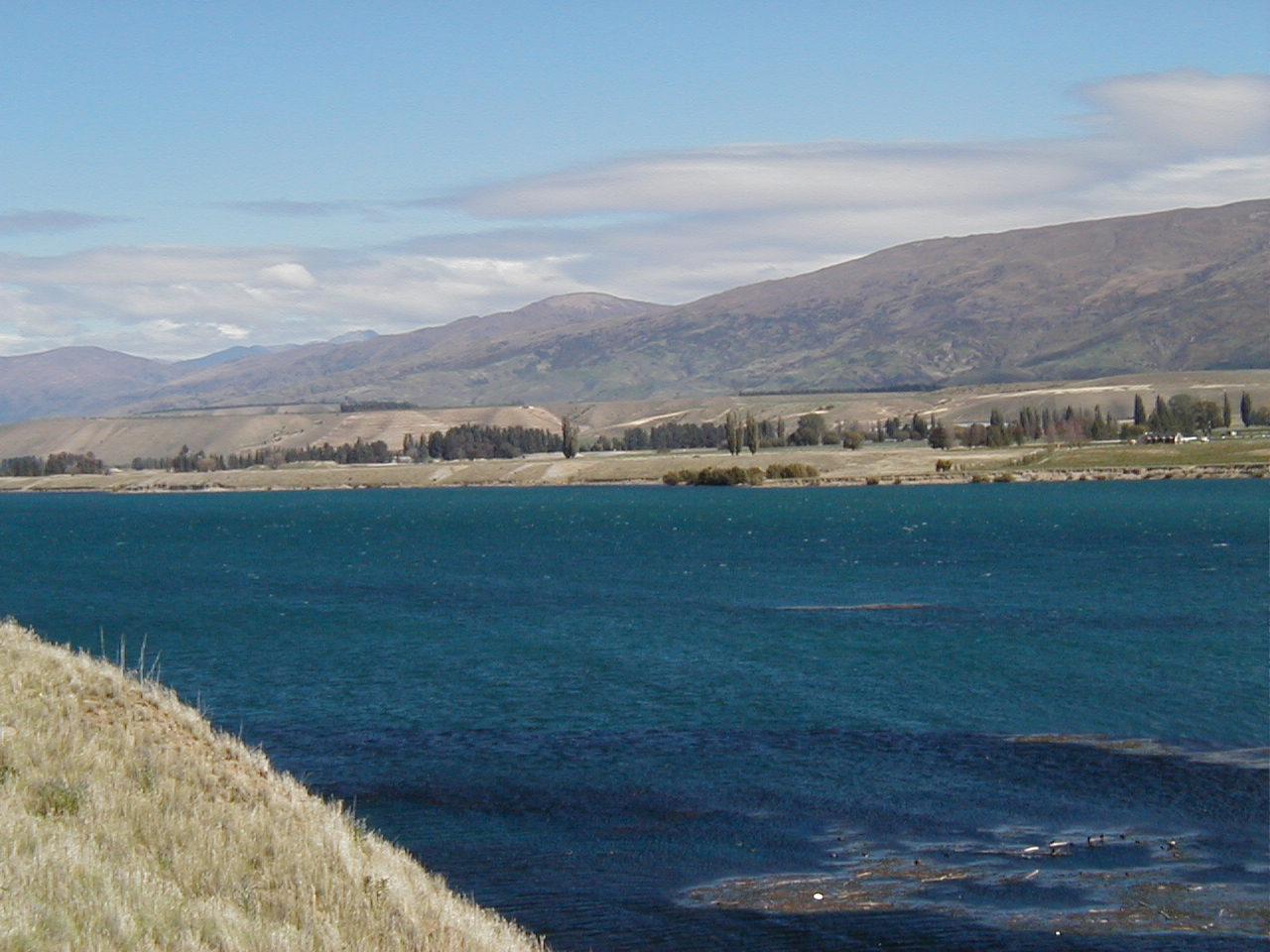 Once at the top I got a spectacular view of the snow-capped Southern Alps of New Zealand on the horizon. In fact, for probably 50km today, I had some fantastic vistas of the mountains and even Mt. Cook was fully visible in the distance (I believe that Mt. Cook was Sir Edmund Hilary's training ground). I stopped for second breaky in Lake Tekapo, where the lake is a very deep blue colour. The village is an alpine tourist venue in the making - chalet and condo construction everywhere - It'll be a packaged tourist trap (like Lake Louise) in no time. Nevertheless, a beautiful spot all the same.